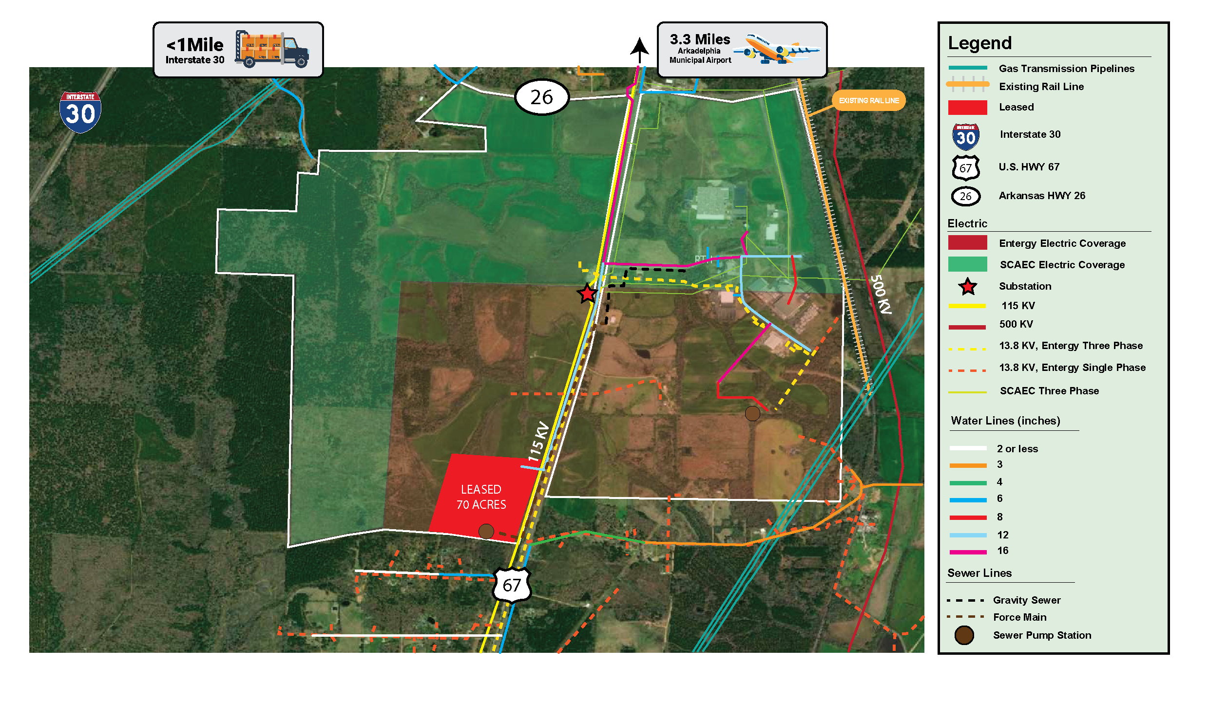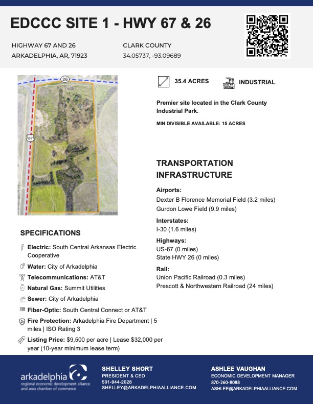 The EDCCC Site 1 is a premier site located in the Clark County Industrial Park, boasting 35 acres of ideal real estate located within 1 mile of Interstate 30. Direct highway frontage to both US Highway 67 and AR Highway is available, making it highly accessible. The site has up-to-date due diligence reports with existing infrastructure in place or planned.
